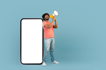 Positive indian guy with megaphone posing by smartphone, making announcement