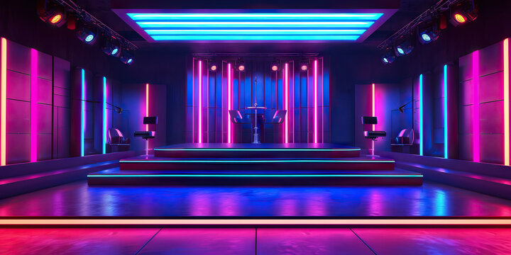 Entertainment Setup: Empty Game Show Talk Show Set Featuring Stage Lighting, Chairs, and a Table