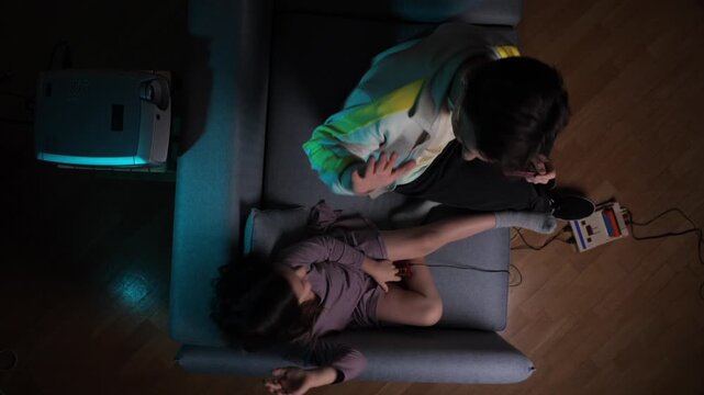Father and young daughter bond over retro game console on sofa in a dim living room, celebrating a high five after a shared win, cozy nostalgic family gaming moment