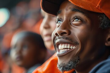 A man wearing an orange hat smiles while watching a baseball game