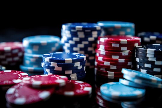 Vibrant casino poker chips stacked on a table with colorful lights illuminating the background during an exciting night of gaming