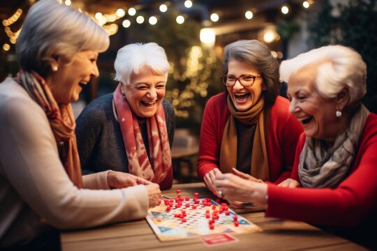 senior women friends  at a home party gathering playing board game, smiling and laughing and having fun