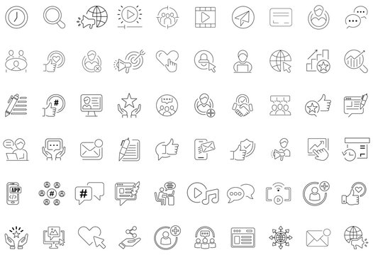 Social media marketing icon set. Communication, network, hashtag, like share vector.  Online community, media, website, blog, content, business marketing and social network icons. Vector illustration