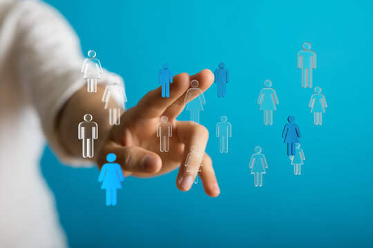 Hand reaching towards network of people icons. Concept of social interaction, online community, human resources, connection, global business, te