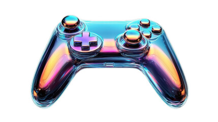 A colorful, futuristic game controller made of glass with a glowing finish. It features round buttons and a cross-shaped control stick.