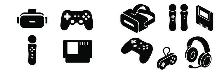 A collection of sleek black and white icons representing various gaming accessories, showcasing controllers, headsets, keyboards, and more for enthusiasts.