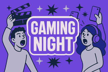 Gaming Night Extravaganza. Gaming Night banner, flat vector illustration, bold oversized text inside sticker outline, cartoon characters shouting with clapper