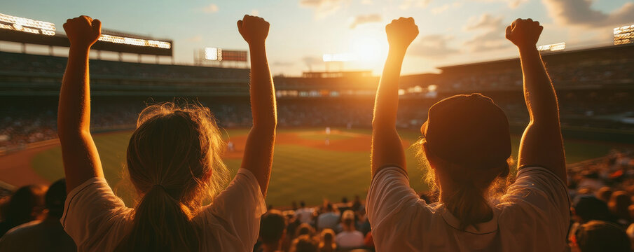 group of fans cheering in stands at american football game with hands raised high, wearing red or white attire with team logos, lively atmosphere during midday light