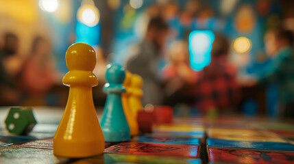 A group of friends joyfully playing a board game around a warmly lit table, their laughter and smiles reflecting the festive decorations and vibrant lights in the background. Generative AI
