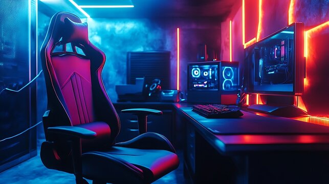 A high-tech gaming chair with LED lighting, placed in a futuristic room
