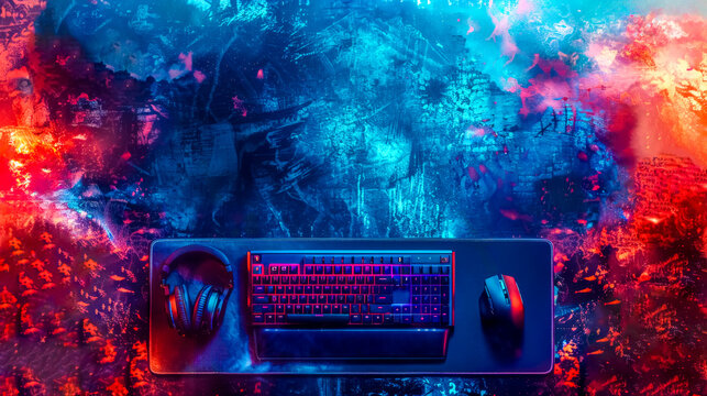 gamer work space concept, top view a gaming gear, mouse, keyboard, joystick, and headset