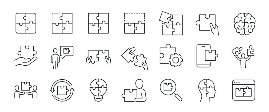 Puzzle simple minimal thin line icons. Related jigsaw, solution, idea, problem solving. Editable stroke. Vector illustration.