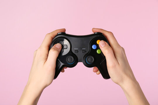 Joypad in hands. Computer gaming concept. Computer display with game in background. RGB light behind the desk.