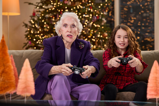 Grandmother and granddaughter enjoy holiday gaming together in a cozy, festive living room setting