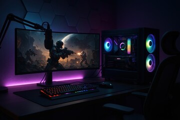 Immersive gaming battlestation in cozy bedroom studio with ultrawide monitor RGB tower ambient lighting ergonomic chair and pro accessories