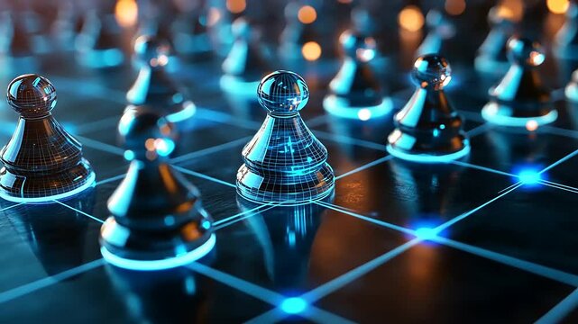 Futuristic chess game with glowing pawns on a digital board, highlighting strategy and competition