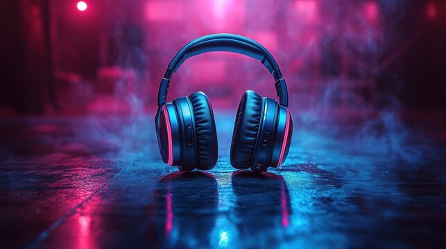 Headphones backlit in vibrant neon light, reflecting on a wet floor, surrounded by smoke