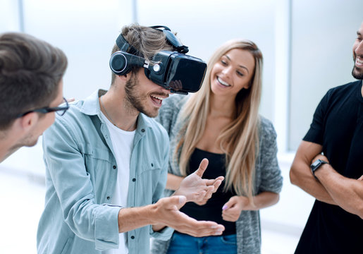 Positive colleagues testing virtual reality glasses