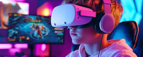 A young coder in a high-tech gaming studio, testing a new virtual reality game they designed.