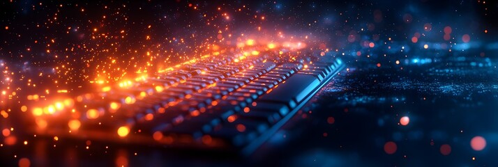 Glowing cyber themed gaming setup with illuminated keyboards and devices isolated on a dark background providing ample copy space for esports event promotions and digital content