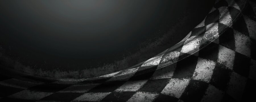 Grungy checkered flag waves dynamically. Abstract racing background with distressed texture. Dark, edgy graphic design for motorsport or speed themes.