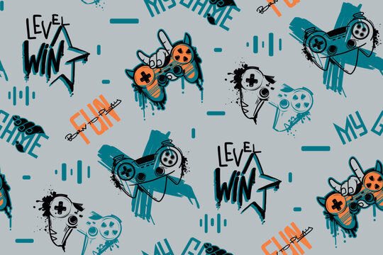Gamepad pattern on grey background. Gaming print with linear gamepads and graffiti words Fun, My game, new level