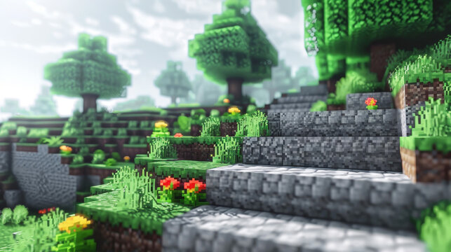 Scenic computer game landscape with stone steps and vibrant greenery