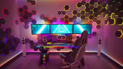Vibrant gaming setup with neon-lit hexagonal wall panels. Multiple monitors display futuristic cityscapes and space scenes. RGB lighting creates an immersive cyberpunk atmosphere for high-tech enterta