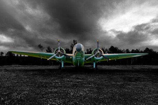 A Lockheed Hudson Bomber rests in an open field in selective colour at the North Atlantic Aviation Museum in Gander, Newfoundland.
