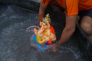 Ganesh Visarjan with lord Ganesha idol immersed in river during festival