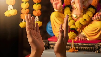 Devotee offering prayers to ashtavinayak lord ganesha idol during the ganesh chaturthi festival for divine blessings and auspicious celebrations