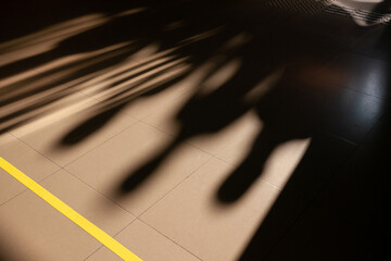 Silhouettes and shadows of people on the city street. Crowd walking down on sidewalk, concept of strangers, crime, society, gang or population