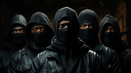 Group of black mafia people gang members wearing balaclava and looking at camera. Generative AI.