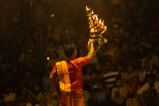 Hindu priest performs religious Ganga Aarti ritual (fire puja). Diwali festival, India
