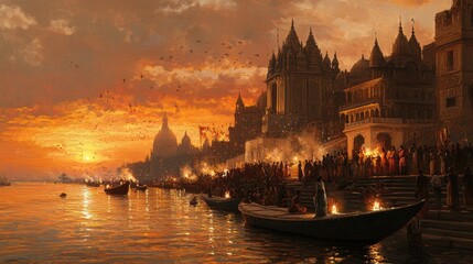 Varanasi Ghats at Sunset: The ghats of Varanasi with people performing evening aarti rituals by the Ganges River, illustrating the spiritual heart of India.