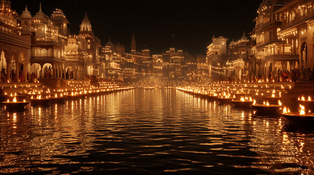 Ganga Aarti at Varanasi ghats, lamps reflected on water, golden dusk, India, Varanasi, Ganges, aarti, spirituality, ritual, river, pilgrimage, culture, with copy space