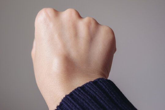 Female right back hand with ganglion cyst on the dorsum,  fluid-filled bump associated with a joint or tendon sheath, close-up view, selected focus.