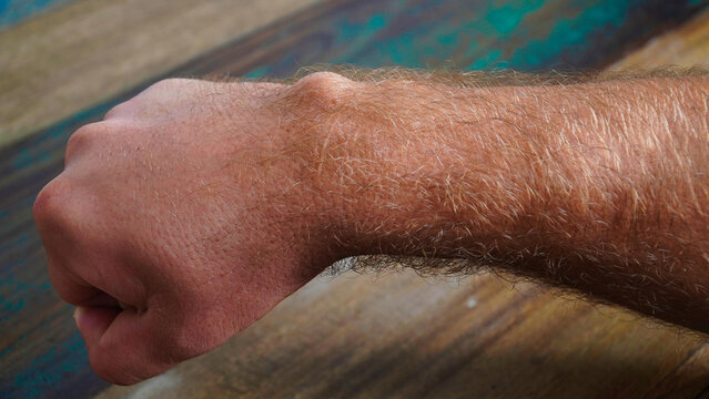 Ganglion cyst on man's hand.hand with a hygroma. Pain. Wrist ganglion cyst.Close-up of a male wrist showing prominent tendons and hair on a wooden surface during daylight