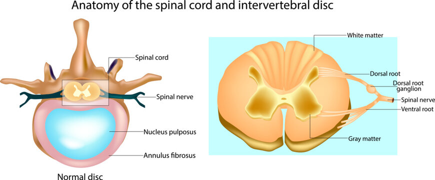 Anatomy of the Spinal Cord and Intervertebral Disc Cross Section Illustration. Medical Diagram of Normal Intervertebral Disc and Spinal Cord Structure. Educational Anatomy Chart of Spinal Nerve, Disc,