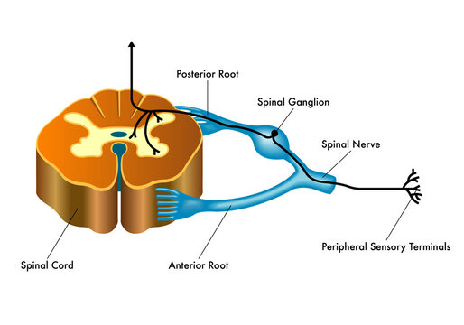 Medical illustration showing the connection of the spinal ganglion to the spinal cord, with annotations regarding the pathway.