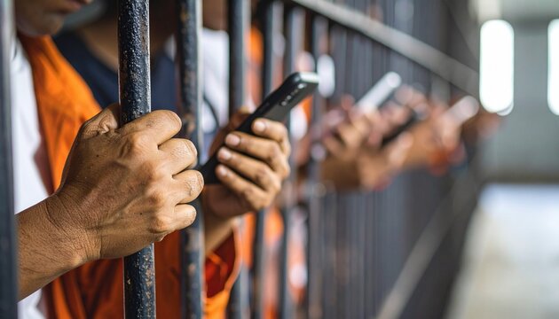 Dark conceptual image of prisoner’s hands holding bars and phone, symbolizing confinement, punishment, and justice themes in crime and prison context.