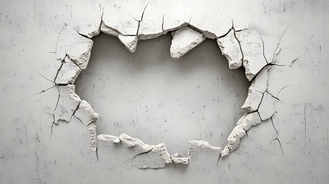 Breach in Foundation: A close-up perspective unveils a textured wall dramatically shattered, revealing the raw inner layers and a gaping hole