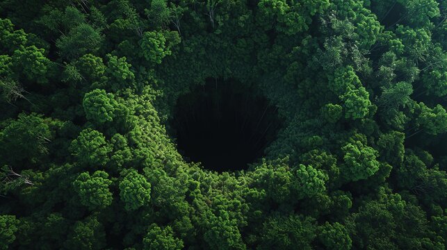 The sunlit verdure of a forest canopy is dramatically interrupted by the gaping darkness of a massive sinkhole, viewed from above.