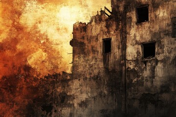 Decaying building with gaping windows stands against a textured background