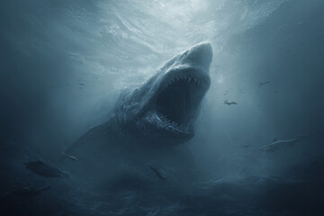 Giant Sea Monster rising from the ocean depths with gaping mouth in terrifying and surreal underwater nightmare