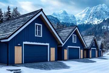 Double detached white garage with black tilt-up retractable raised panel metal door and gable metal roof