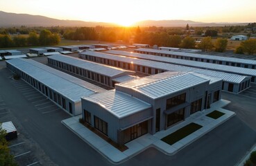 Storage units facility from above at sunset. Rows of metal garages with individual doors and a central office building. Property in a rural area with distant hills and trees.