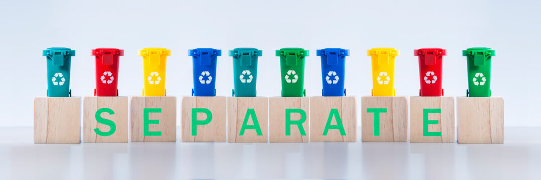 Recycling word letters on containers for metal, glass, paper, organics, plastic for further processing of garbage.