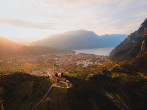 Aerial view of the town nestled between verdant hills and the tranquil lake, bathed in the soft glow of the setting sun, Tenno, Trentino-South Tyrol, Italy.