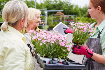 Plant nursery worker helping couple shopping for flowers in sunny garden